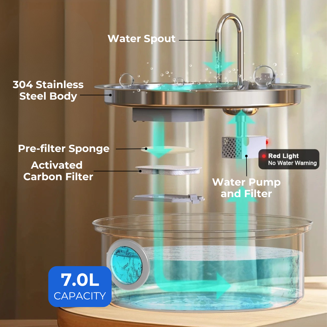 A red light will show by the base of the spout if the water low. The pump has a built-in safety feature that shuts off automatically if the water level is too low to prevent damage and overheating.